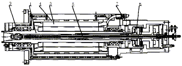 用于大型數(shù)控銑、加工中心的內(nèi)裝式電主軸單元(圖1)由主軸軸系1、內(nèi)裝式電機(jī)2、支承及其潤滑系統(tǒng)3、冷卻系統(tǒng)4、松拉刀系統(tǒng)5(用于數(shù)控車床的是卡盤、油缸對接法蘭)、軸承自動卸載系統(tǒng)6、編碼器安裝調(diào)整系統(tǒng)7組成。
