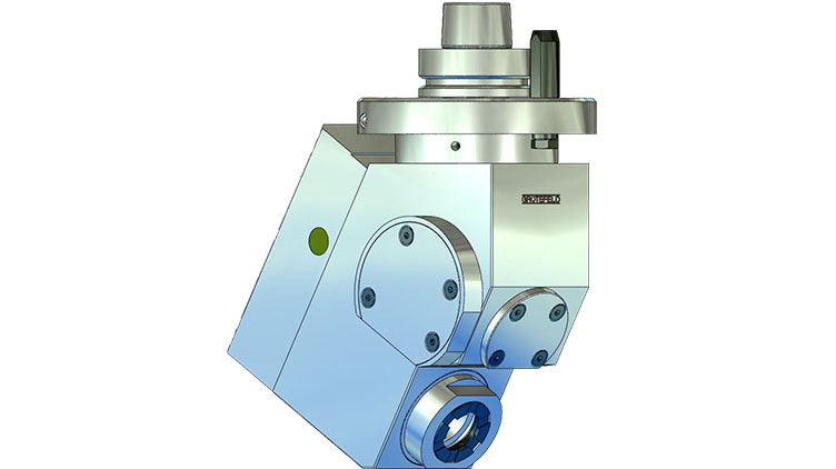 W56 角銑頭配備加工主軸,可在向上 15° 至最大向下 31° 的范圍內(nèi)以固定角度布置。之后無法更改指定的角度。主軸的旋轉方向與驅動器的旋轉方向相反。驅動速度以 1:2.06 的比例傳輸?shù)降都堋?/span>間歇運行時主軸最高轉速可達 16,000 rpm。